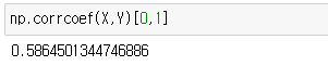 당연히, numpy는 없는게 없죠. corrcoef() 함수를 이용하면,