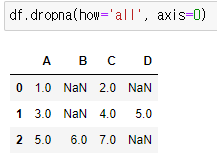 자, 그럼 만약 어떠한 행에 모든 값이 NaN인 경우에만 지우고 싶은 경우에는 어떻게 하면 될까요?